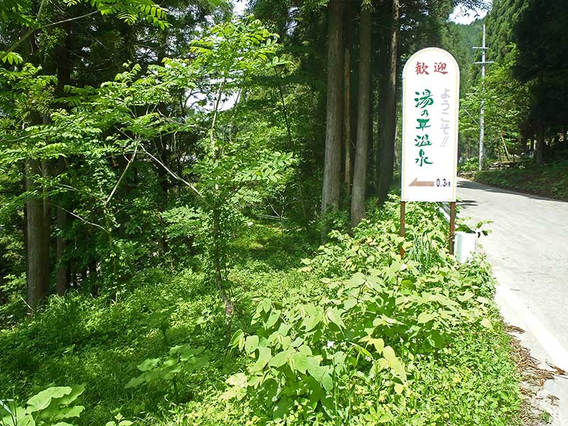 現・井田橋を渡って左を見ると、 旧道橋に行くための道がありました。 雑草におおわれて分かり辛いですが、 画面の真ん中に道があります。 そして右の看板。 湯の平温泉にはこちらという訳ですが、 旧道橋が現役時代に立てられた 看板なのでしょう。 |