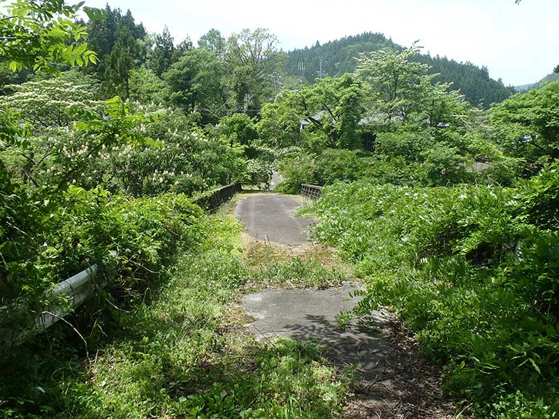 今の季節はまだましですが、 8月とかには雑草がさらにのびて 通り辛くなりそうだよ。 思った通り橋の上は雑草だらけ。 でも通行止めじゃありません。 ここまで車で通ろうと思えば 通れそうです。 …雑草が無ければ、ですがね。 |