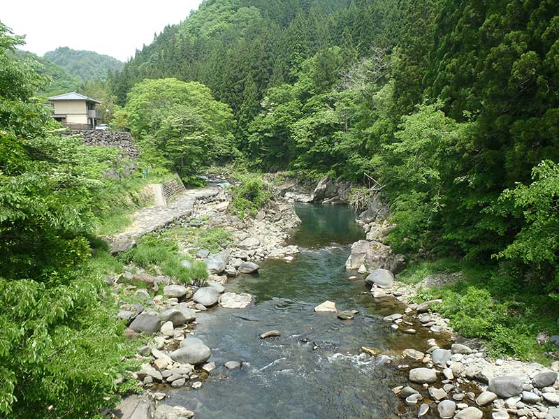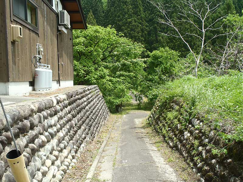 旧橋からの道は細いですが、 これは後から狭められたからです。 昔の航空写真を見ると、 橋と同じ幅の道になってます。 隣の宿泊施設が出来た時に 石垣が造られたのでしょう。 右の石垣の場所には 田んぼがあったみたいですが、 今は空き地になってます。 |